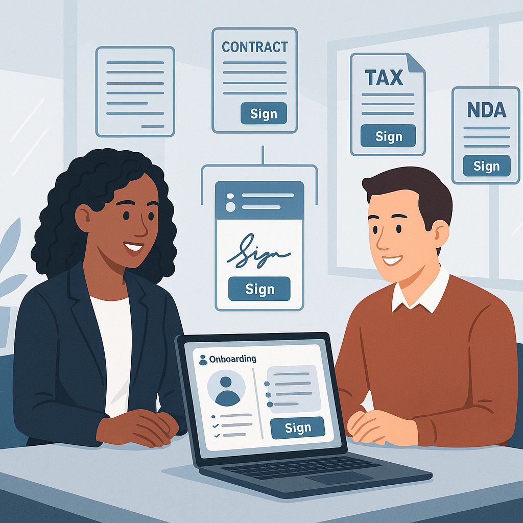 HR and operations teams know that “welcome to the company” often starts with… a pile of paperwork. New hires juggle offer letters, tax forms, NDAs, policy acknowledgements, and benefits enrollments—often across email threads, shared drives, and paper forms. Documents go missing, signatures are delayed, and onboarding stalls.